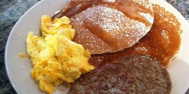 Pancakes, sausage, scrambled and cooked to order eggs, biscuits, sausage gravy, fruit cocktail, coffee, juice, water, and dessert. All you can eat!